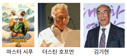 포와 무적의 5인방의 스승인 마스터 시푸 역은 더스틴 호프먼이 목소리 연기를 했습니다. 더스틴 호프먼은 올해로 88세를 맞은 할리우드 연로 배우로서 그간 수많은 영화들에서 인상적인 연기력을 보여줘왔습니다. 한국판에서는 '목소리 연기' 경력만 50년인 베테랑 성우 김기현이 연기하였습니다.